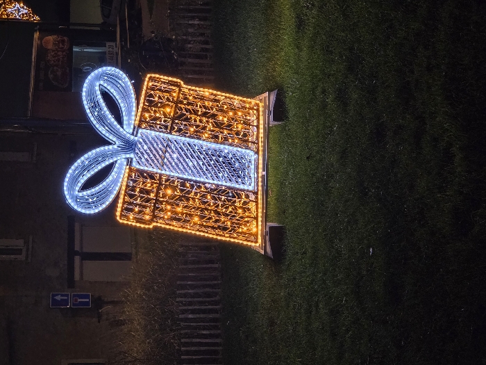 An illuminated decoration depicting a wrapped gift sits on a patch of grass. The gift is boxy and orange with a white stripe. It is topped with a blue bow. Behind the decoration, a building is visible, along with signage. A set of stairs is on the left side of the decoration. The grass is dark and appears to be well-maintained. The scene is likely at night or in low light conditions.