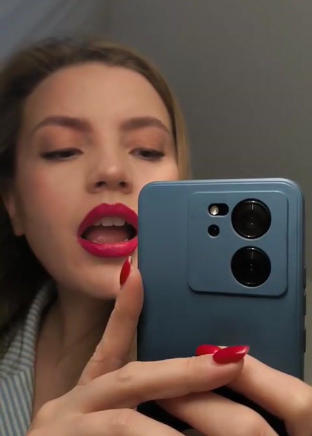 A young woman with blond hair and red lipstick is taking a selfie in a mirror. She is wearing a striped shirt. Her nails are painted red, and she has a silver ring on her finger. She is holding a blue smartphone with a dual-lens camera. The background is a neutral gray.
