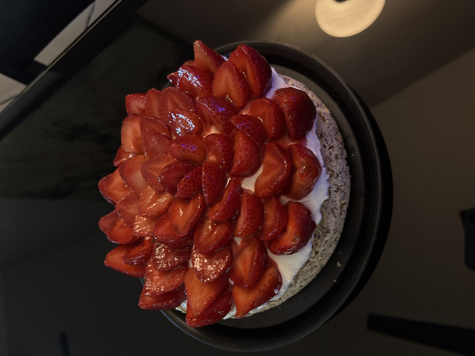 - "The image displays a circular dessert, approximately 20-25 cm in diameter, centered on a matte black round plate" by FM-BtwHm1, licensed under CC BY 4.0