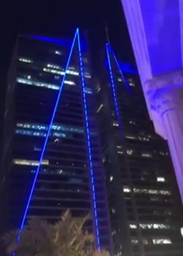 tall skyscraper at night, likely in a city. The building has many lit windows, and the top is illuminated with blue lights. There is a palm tree visible at the bottom of the frame. To the right of the skyscraper, part of a building with a blue light and ornate details is visible. The overall scene is dark, and the buildings stand out against the night sky.