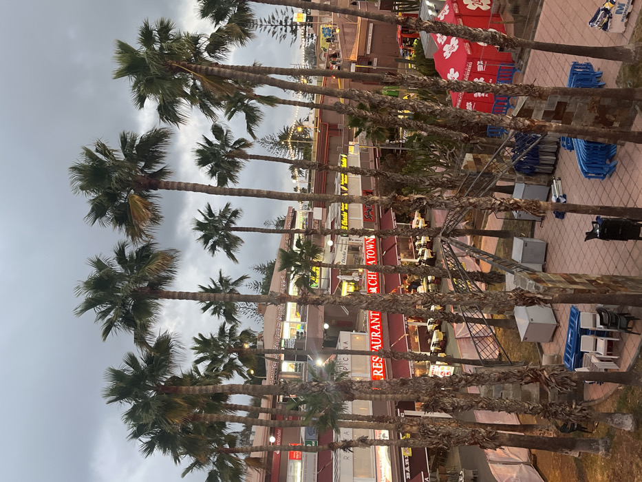 The image depicts an elevated view of a commercial complex within the city of Playa Del Inglés, Spain, under an overcast, twilight sky. Numerous tall palm trees, characterized by rough, segmented trunks and green fronds, are prominent throughout the scene, partially obscuring the multi-story buildings behind them. The commercial complex features multiple businesses with illuminated signs, including a "RESTAURANT" with a red awning and "CHIA TOWN." Other visible signs include "Santander" and "Spar." Many ground-level establishments feature outdoor dining areas furnished with tables, white tablecloths, and chairs, some occupied by patrons. In the mid-ground, an open-air patio area with terracotta-colored tiles is visible, framed by palm trees. This patio contains stacks of blue plastic chairs, several grey metal utility boxes/containers, and an arrangement of white and dark chairs. A metal arched structure, possibly a walkway or decorative element, spans part of this patio. To the right, two red pop-up tents with white floral patterns and "PRAVITA" and "24h" branding are erected. A blue and yellow object, possibly a barrier or sign, is positioned near these tents. Artificial lighting from building interiors, signs, and string lights illuminates the scene.