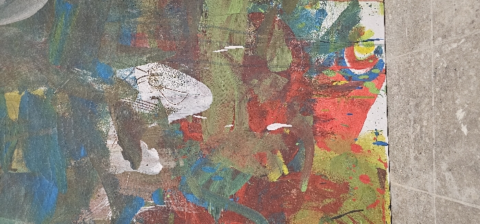 An abstract painting displays a chaotic mix of colors including blue, green, red, yellow, and white. Brush strokes are visible in varying directions. The edge of the canvas is visible, next to a gray tiled surface, adding a contrasting texture. The paint application appears thick and layered.