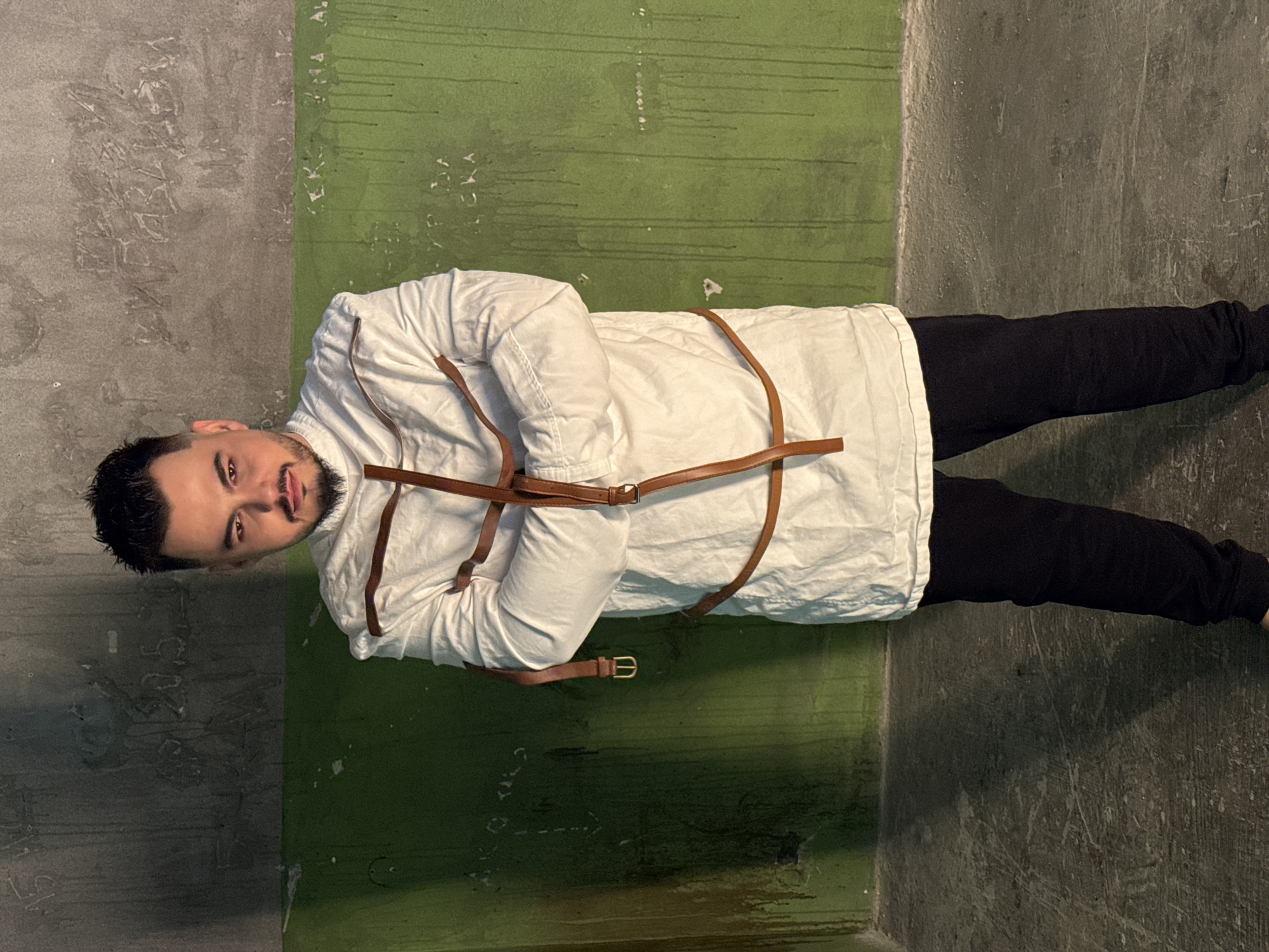 A male subject stands centrally in a full-length, front-facing portrait within an interior space in the city of Sofia, Bulgaria. The individual, appearing to be an adult male with dark hair, a neatly trimmed goatee, and a mustache, maintains direct eye contact with the camera. He is dressed in a white, canvas-like garment resembling a straitjacket, secured by multiple brown leather-like straps that crisscross his chest and encircle his torso, binding his arms in a folded position across his midsection. He wears dark-colored trousers. The background consists of a textured wall divided horizontally into two distinct sections. The upper section is exposed, rough grey concrete, marked with various etched or scratched inscriptions including the numerals "15" and "20.5", and several words in Cyrillic script, notably "ИНФАРКТ" (heart attack/infarct). The lower section of the wall is painted a dark olive-green color, exhibiting numerous vertical drips of dried paint. This green section also bears faded Cyrillic inscriptions, with discernible fragments suggesting words like "ЧЕРНА РЕКА" (black river) and "БУДА" (Buddha). The floor is a dark grey, scuffed concrete surface. The lighting appears artificial, casting soft shadows and illuminating the subject directly. The overall environment suggests a utilitarian, possibly industrial or abandoned urban setting, typical of certain structures within Sofia, Bulgaria, as indicated by the Cyrillic script and architectural style.