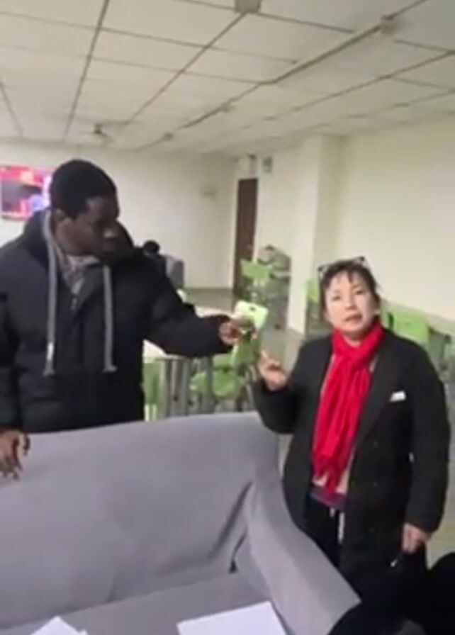 A short video shows a woman and a man in a room. The man is Black, wearing a dark jacket, and gesturing with his hands. The woman is Asian, wearing a dark blazer, red scarf, and glasses on her head. She is also gesturing with her hands. They are standing in front of a grey couch. Behind them are tables and chairs, and a television screen in the background. The room has a white ceiling with a ceiling fan. The video seems to be focused on the two people and their interactions, although the exact nature of their conversation is unclear.