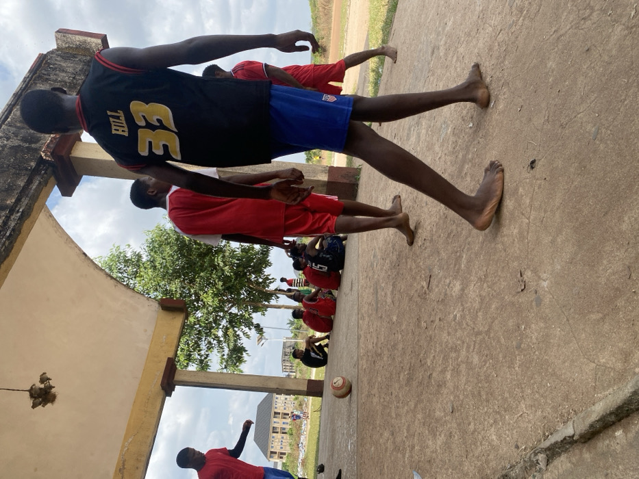 The image depicts an outdoor scene at a recreational area in Ihiagwa, Nigeria, under a partly cloudy sky. Approximately ten young males of African descent are present. In the immediate foreground, a male wearing a black sleeveless jersey with "HILL 33" in yellow on the back and blue shorts with a white logo walks barefoot towards the left. To his left, another male in a red t-shirt and red shorts also walks barefoot. On the far left, a third male in a red t-shirt and blue shorts stands, appearing to interact with a worn, light-colored soccer ball positioned on the concrete ground near his feet. Several other males are seated barefoot on the discolored concrete surface beneath a simple, open-sided concrete shelter. This shelter features a curved, light-colored roof, supported by brown pillars, and exhibits signs of wear, including a small, dark, intricate object (possibly an old fixture or nest) hanging from the ceiling. The seated individuals are primarily dressed in red or black jerseys, one clearly showing "15." Beyond the concrete area, the ground transitions to an open field of dirt and sparse grass, with green trees visible in the mid-ground. In the background, several multi-story buildings, one prominent with a light-colored facade, are visible, along with a utility pole equipped with a street light. The overall scene suggests a casual gathering or a break during a recreational activity, likely soccer.