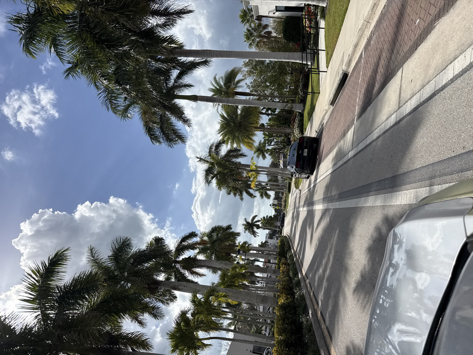 The image presents a bright daytime view of a well-maintained, tree-lined street in Naples, Florida, USA, observed from the interior of a light-colored vehicle. The sky overhead is predominantly blue, punctuated by large, fluffy white cumulus clouds, with visible sunbeams emanating from behind the clouds on the left. The scene is dominated by numerous tall palm trees, likely Royal Palms, which line both sides of the asphalt roadway, casting long, distinct shadows across the pavement and sidewalks. The street features a visible double white line separating two lanes of traffic, with a gray median strip between them. On the right side of the street, a black Ford Mustang, appearing to be a recent model, is parked facing away from the camera on a red brick paved shoulder, bordered by a concrete curb. Beyond the shoulder, a manicured lawn and a modern, light-colored building with a dark roofline are partially visible. Black metal railings are also present along the right sidewalk. On the left side of the street, beyond a low hedge and additional palm trees, glimpses of other light-colored buildings are discernible in the distance. Streetlights are intermittently spaced among the palm trees. No individuals are visible within the frame. The overall environment conveys an upscale urban or suburban thoroughfare, well-landscaped and devoid of pedestrian or active vehicular traffic at the moment of capture.