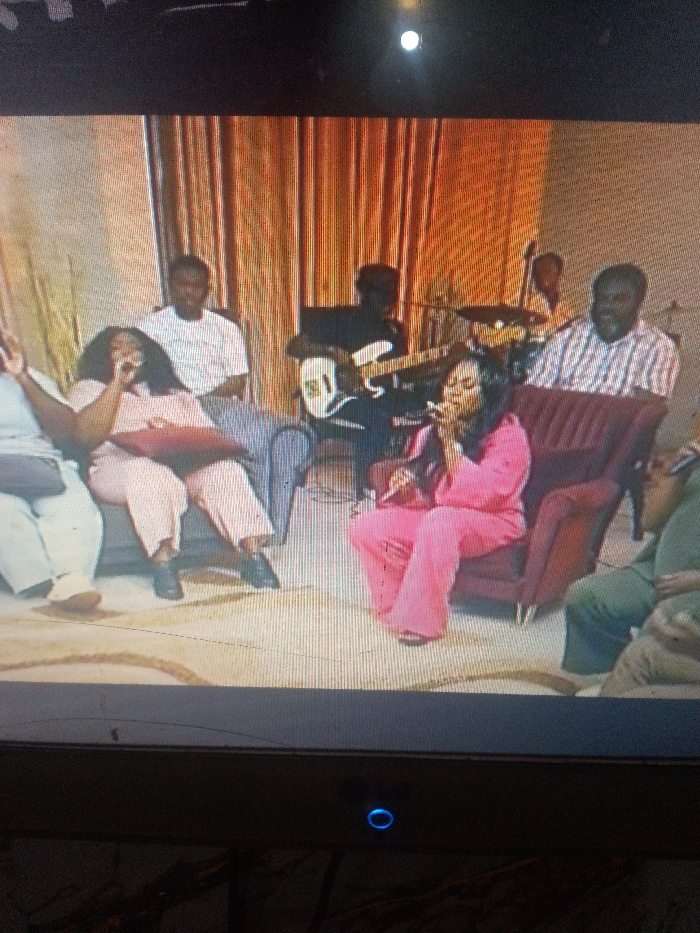A group of people are gathered in a room, some seated on a sofa and chairs, while others are positioned behind them, possibly playing musical instruments. The room has a warm-toned curtain as a backdrop. A woman in a pink outfit is seated in a red chair, holding something in her hand, seemingly addressing the group. Another woman, wearing a similar outfit, is sitting on the sofa to the left. The image appears to be a still from a performance or informal gathering.