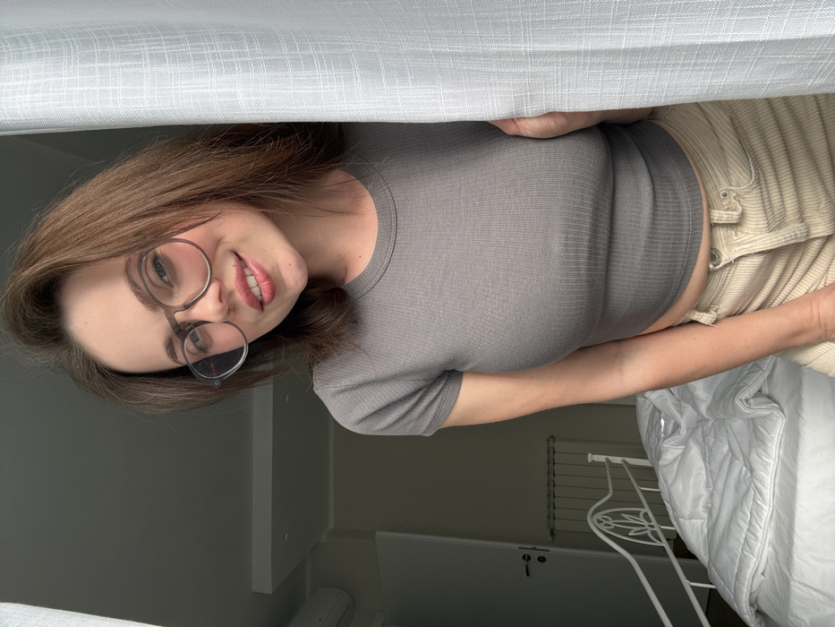 A young adult female, with shoulder-length brown hair and wearing clear-framed eyeglasses, is depicted in an indoor setting, stated to be in Scafati, Italy. She is posing for a photograph, looking directly at the camera with a smile; her lips are slightly parted and show a red lip product. She wears a grey, ribbed, short-sleeved crop top and light beige corduroy pants. Her right side and right hand are partially obscured by a white textured curtain, which her hand appears to be holding or resting against. The background on the left side of the frame reveals a light-colored bedroom with a white, ornate metal bed frame holding white bedding. Further left, a light-colored door, a white wall-mounted radiator below it, and a white air conditioning unit above it are visible against the light-colored wall. The ceiling is also light-colored, and the scene is illuminated by what appears to be natural light.