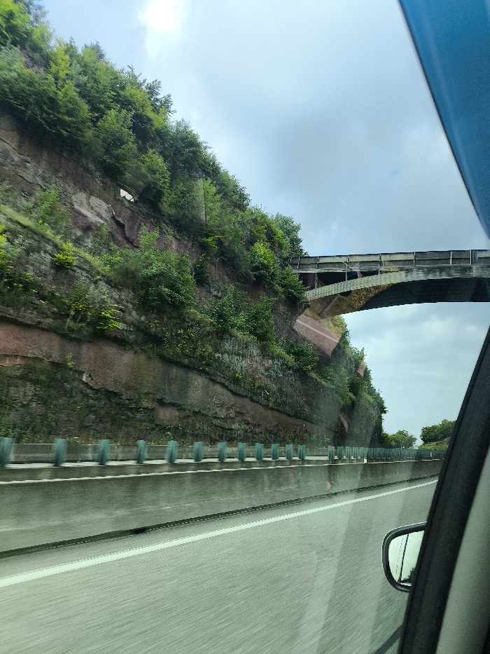 The image depicts a highway scene in Eckartswiller, France, viewed from a moving vehicle. The foreground shows a multi-lane concrete highway with a solid white line on its right edge, exhibiting motion blur. To the immediate left of the highway is a concrete barrier topped with a series of greenish-teal vertical posts. The right side of the frame includes a partial view of a vehicle's blue-trimmed A-pillar and a portion of its side mirror. In the midground, a significant, heavily vegetated rock cut rises steeply, displaying distinct horizontal stratification in shades of reddish-brown and gray. Numerous green trees and bushes cling to the rock face, with particularly dense foliage on the upper sections. A small, dark, arched opening or tunnel entrance is visible high on the rock face, towards the upper left. The background features a multi-span bridge, likely an overpass, crossing above the highway. The bridge structure appears to be concrete with an arched support visible beneath the main deck, and a barrier or fence runs along its top. The sky above is overcast with patches of brighter cloud cover. No individuals are visible in the scene.
