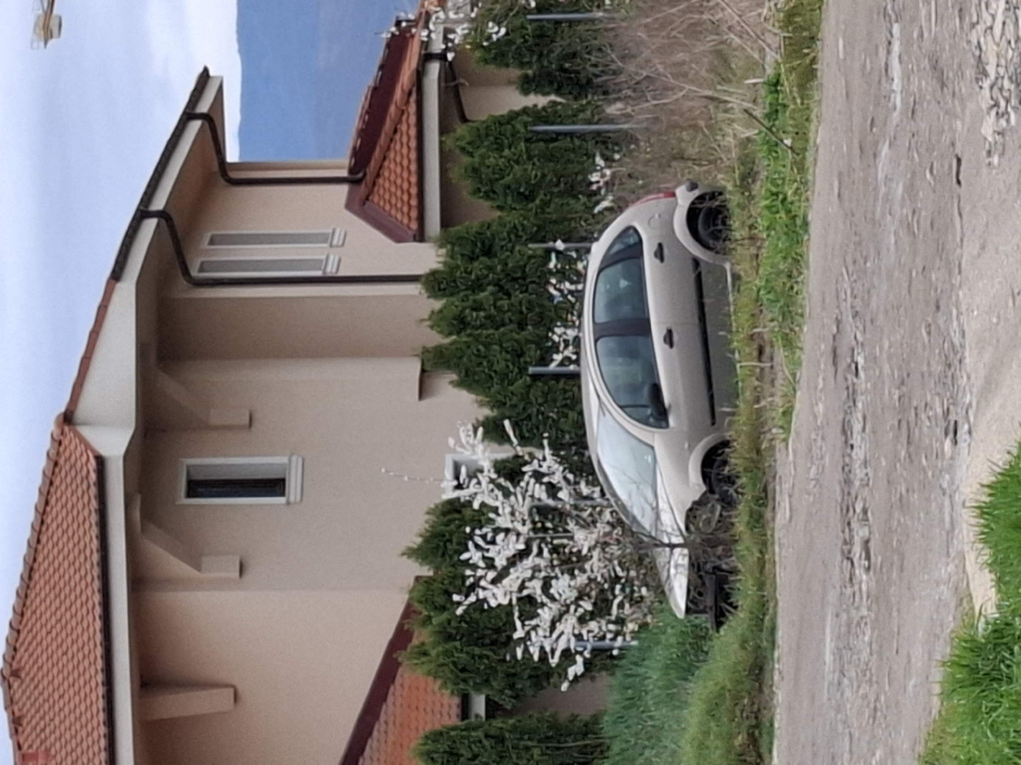 beige car parked on the side of a narrow road in what appears to be a residential area of Plovdiv, Bulgaria. The car is positioned partially off the paved surface, with some of its wheels on the grassy verge. The road is unpaved and appears to be in poor repair. Adjacent to the road is a beige house with a red tile roof. The house has multiple windows and gutters. Green evergreen shrubs and a flowering tree separate the car from the house. The sky is overcast.