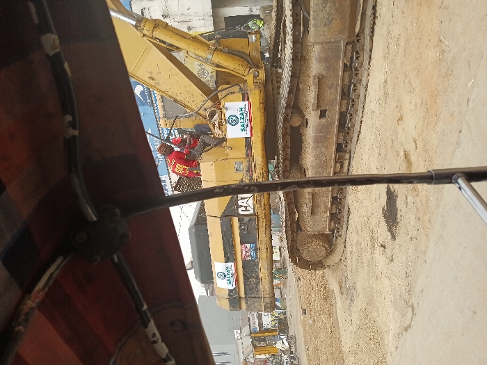 A yellow Caterpillar (CAT) track-hoe excavator is stationary on an unpaved dirt road in Fagge D2, Nigeria