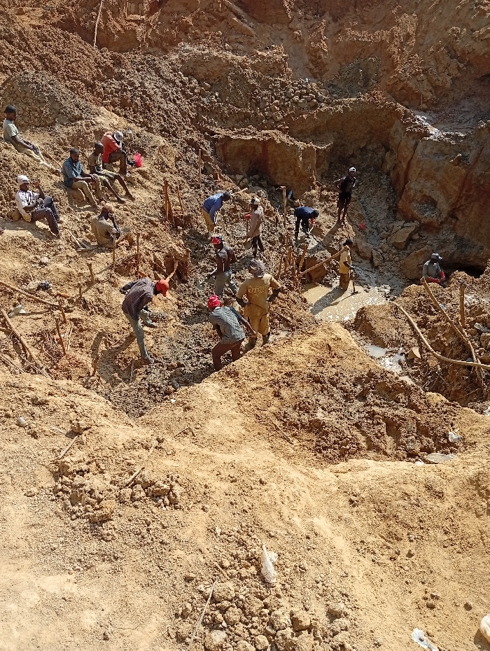 The image displays an open-pit mining or excavation site in Katon Rikkos, Nigeria, characterized by significant soil displacement and active human presence