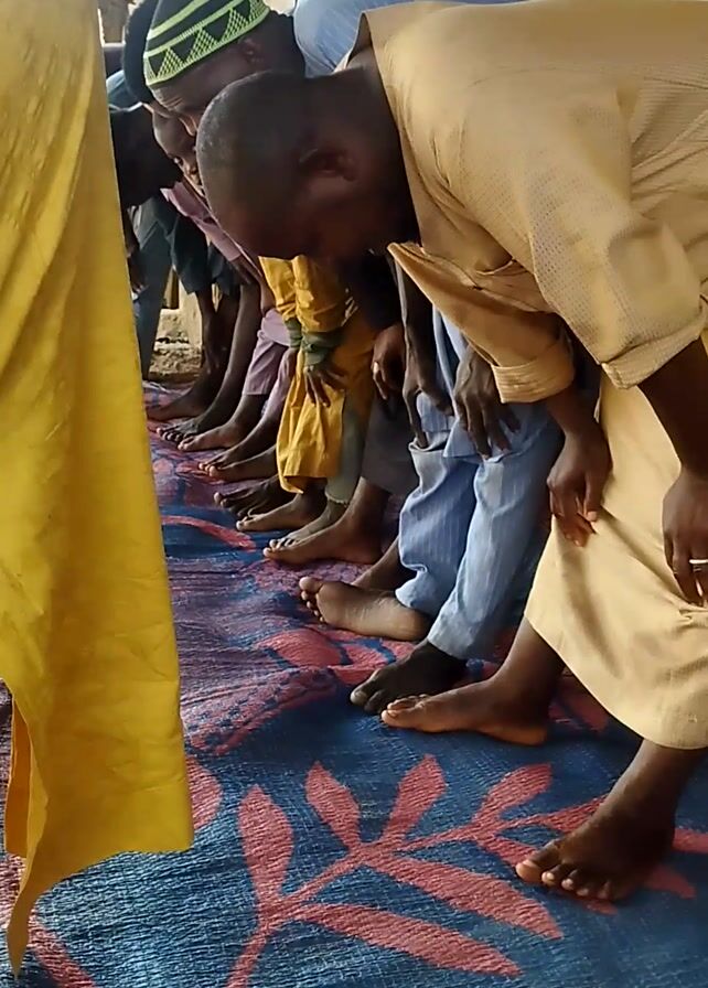 A group of men and children are sitting on a mat indoors. They are lined up side-by-side. Some are wearing traditional African clothing. They appear to be leaning or bowing. The room appears simple and the mat has a colorful pattern.