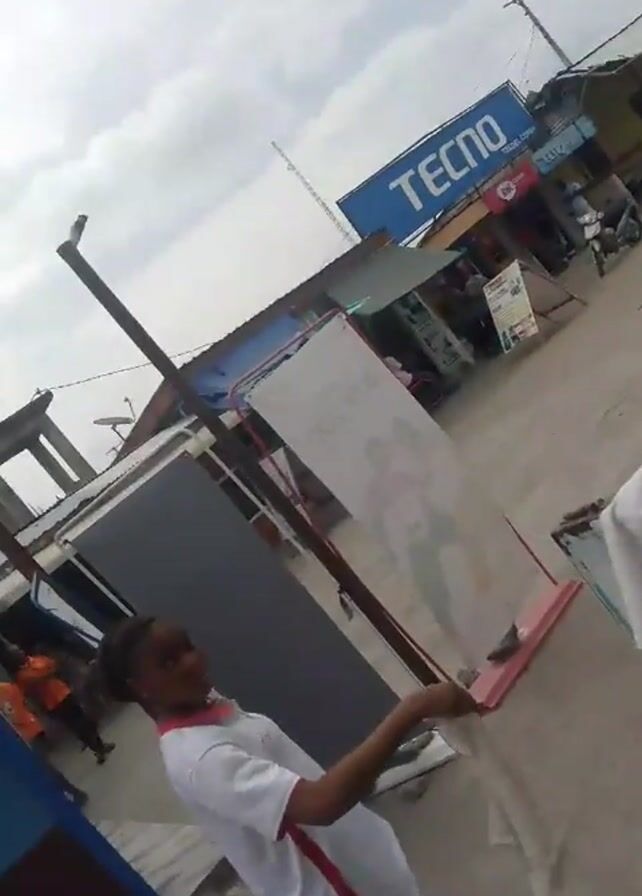 The video begins with a close-up shot of an "Ace Gadgets" sign, advertising "London Used Phones," "iPhones Available," and "Phone Swapping." The camera pans up to reveal a street scene with a "Tecno" sign in the background. A person wearing a white and red shirt, black pants, and sandals walks into the frame. They are seen holding a white cloth, possibly a towel. The camera focuses on the person's feet and the concrete ground, which appears damp with water stains.
