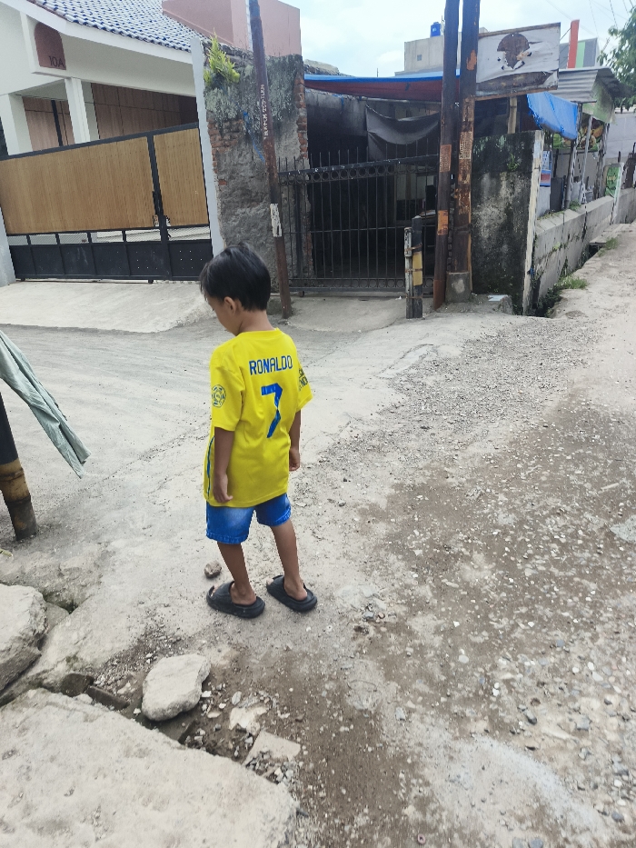 A young boy stands on a cracked and uneven concrete surface in what appears to be a residential alleyway. He is wearing a yellow jersey with "RONALDO" and the number "7" on the back, along with blue shorts and black sandals. The background features houses with a mix of brick and painted walls, some with gated entrances and overgrown vegetation. Power lines and a cloudy sky are visible above.