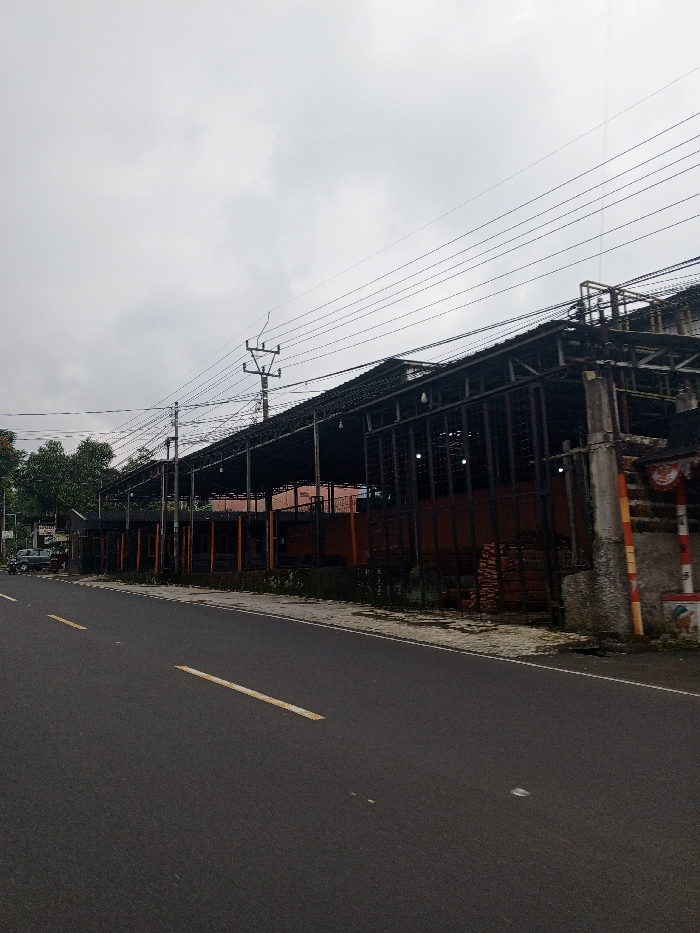 The image depicts a roadside scene in the city of Qorday, Kazakhstan, under an overcast sky. The foreground features a dark asphalt road with a dashed yellow center line and a solid white edge line on the right. No individuals or active vehicles are present on the road. To the left, a light-colored vehicle, possibly an SUV, and a scooter are parked on a dirt shoulder partially obscured by trees. Dominating the right side of the frame is a long, low-rise industrial or commercial building with a dark, sloped roof supported by a visible metal truss framework. The building's facade consists of numerous vertical dark metal posts and a dark horizontal beam structure, creating an open-front appearance. Behind this metal framework, an orange-brown interior wall or structure is visible, along with multiple stacks of reddish-brown bricks at ground level. Several light fixtures hang from the ceiling within the building's open structure. Along the road, parallel to the building, stand multiple utility poles. A prominent T-shaped utility pole is visible in the mid-left, supporting numerous overhead power lines that traverse horizontally across the upper portion of the frame. Green foliage from trees is visible on the far left, behind the parked vehicles. Smaller patches of green vegetation are present along the base of the building. The far right side of the building terminates with a concrete pillar, partially painted with vertical red and yellow stripes, adjacent to a lower, decorative wall element. The overall lighting is diffused and consistent with a cloudy day.