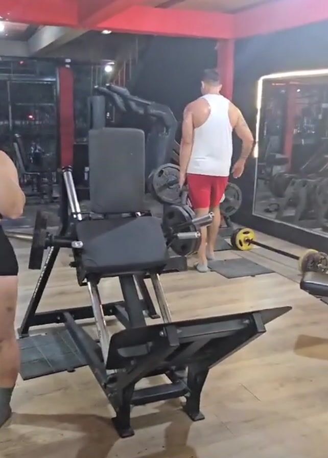 woman in a gym, posing and taking a selfie in a mirror. She is wearing a black crop top and black shorts. She also has gray socks and glasses. She is holding a pink cellphone. There is a leg press machine next to her. Another man is working out in the background. The gym has red pillars, a fan on the ceiling, and a shiny wooden floor.