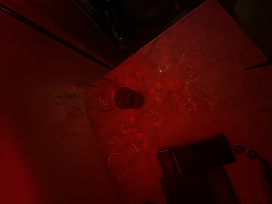 - "A red-toned overhead shot shows a table with multiple wine glasses, a carafe, and a red glass" by FM-oEXuH2, licensed under CC BY 4.0