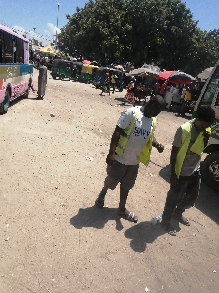 A dusty ground surface dominates the frame. Two men wearing yellow vests stand to the right. A bus with pink and blue accents is partially visible on the left. In the background, several small three-wheeled vehicles, along with various tents and vendors, suggest a bustling market area. A tall tree provides shade over the scene. A man wearing a robe is seen on the left, apparently entering the bus.