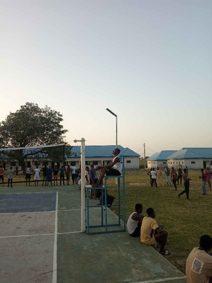 The image depicts an outdoor recreational area within the city of Rigachikun, Nigeria, during late afternoon. The scene is dominated by a concrete volleyball court in the foreground and a grassy field stretching into the midground. On the left side of the foreground, a portion of a concrete volleyball court is visible, marked with white lines on a dark blue and light green surface. A light blue metal referee stand is positioned next to the court. A young male, wearing a white tank top and dark shorts, is seated on the top platform of this stand, facing towards the right and looking slightly upwards. A volleyball net extends across the court, anchored to a pole adjacent to the referee stand. Behind the court, to the left, approximately 15 to 20 individuals, predominantly young males, are standing and observing. They are positioned near a large, mature tree with dense green foliage. Behind this group and the tree, a row of single-story buildings with light-colored walls and distinctive light blue corrugated metal roofs are visible. In the midground to the right of the court, a grassy field is populated by another group of approximately 10 to 15 young males. Some are standing, while others appear to be walking or casually observing. In the immediate right foreground, two young males are seated on the concrete edge of the court, facing away from the court towards the grassy area. One wears a white tank top, and the other a yellow t-shirt and shorts. A third individual is partially visible in the bottom right corner, also facing away. A tall, grey pole equipped with a solar panel and a street light fixture stands upright behind the referee stand. The sky above is clear, transitioning from a pale blue overhead to a lighter, yellowish hue near the horizon, indicative of approaching dusk.