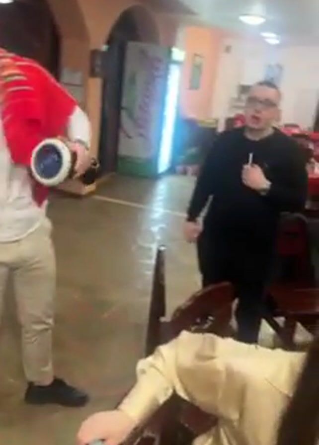 man dancing in a restaurant, playing a small drum-like instrument and wearing a white shirt, khaki pants, and a red scarf. Another man with glasses joins in, raising his arm. The camera then pans across a long table covered in food and drinks, with a red tablecloth. People are seated around the table, some talking and looking at their phones. The restaurant is decorated with archways and has a window with a sheer curtain. Other individuals walk around the scene.