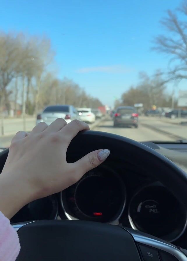 driver's point of view inside a car on a road with other vehicles. The dashboard and steering wheel of the car are visible. The driver's left hand is on the steering wheel. The car is moving slowly in traffic on a sunny day with a clear blue sky. Trees line the road. The dashboard indicates that the car requires servicing.