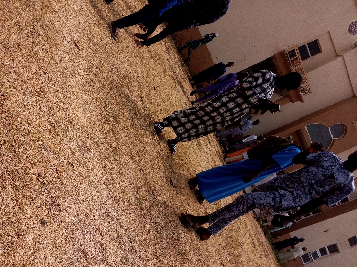 The image depicts an outdoor scene in Unknown, Nigeria, featuring multiple individuals on a dry, grassy field in front of a light-colored building. **People:** Approximately 10-15 individuals are present. In the mid-ground, a male wearing a black and white checkered long-sleeved robe and black and white striped slides is observed looking at a mobile phone held in his hands. To his right, another individual wears a long blue robe with a dark bag slung over their shoulder. In the foreground, a male in a blue and white patterned short-sleeved top and trousers, with dark sandals, stands with his right arm partially raised. Other individuals are distributed throughout the scene, dressed in various garments including dark robes, blue trousers and tops, and lighter-colored attire, all appearing to be standing or walking. **Environment:** The ground is composed of dry, light brown grass and exposed soil. The background features a light beige or cream-colored building, approximately two stories high, with multiple dark-paned windows, some exhibiting decorative lintels. Several arched decorative elements, potentially windows or niches, are visible on the building's facade, along with a prominent, possibly circular or octagonal, relief on the upper section. The scene is illuminated by natural daylight.