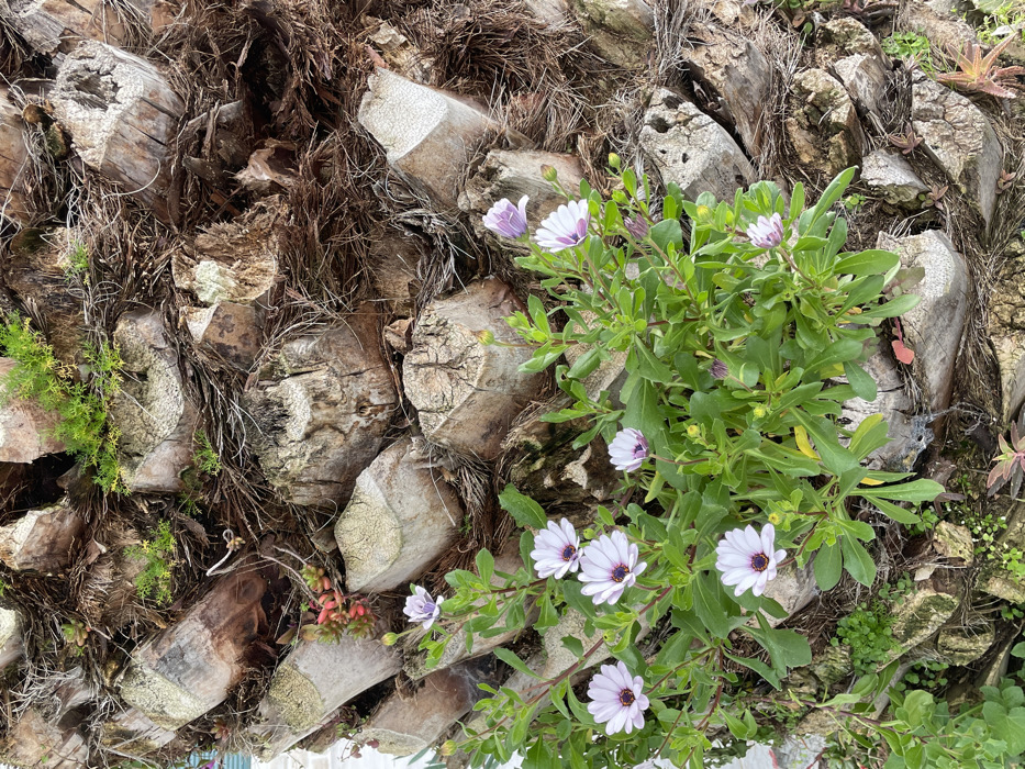The image displays a close-up, vertical view of a palm tree trunk located in Donja Lastva, Montenegro. The trunk's surface is composed of overlapping, dried, fibrous brown bases of trimmed fronds, exhibiting exposed lighter wood at cut ends and interwoven dark brown fibers. A cluster of flowering plants with green foliage is prominently situated in the lower-central area, rooted on the trunk. This cluster features seven open flowers, each possessing white petals with a light purple underside and a dark purple-black central disc. Multiple unopened flower buds are also present. Smaller patches of bright green, fine-leafed plant growth are visible in the upper sections of the trunk, alongside a cluster of reddish-pink succulent-like plants on the left side and other sparse green vegetation. No individuals, specific actions, or interactions are depicted.