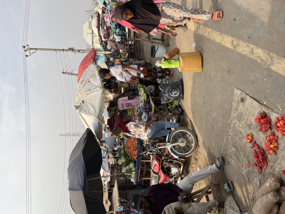 A bustling marketplace scene unfolds. A woman in a headscarf walks past a stall overflowing with goods. Another woman in a white blouse serves a customer. A pink jersey is displayed. A motorcycle rests near produce. A man sits nearby. Piles of red chili peppers lay on a tarp. Umbrellas offer shade amidst the activity. Power lines stretch across the sky.