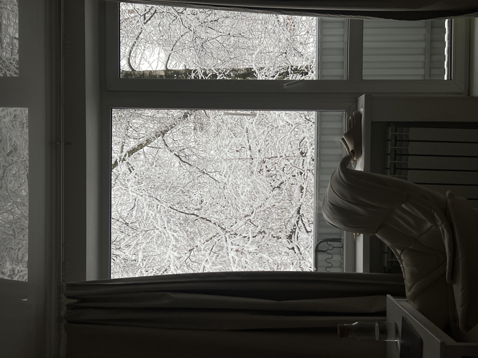 The image displays an interior room looking out through a large, white-framed window onto a snow-covered exterior scene in Saint Petersburg, Russia. The outdoor environment is dominated by numerous deciduous tree branches heavily blanketed in white snow, creating a dense, intricate pattern against an overcast sky. To the right of the main window section, a snow-covered balcony or exterior walkway is visible, featuring a white, vertically ribbed barrier. Inside, the room is dimly lit, with light originating primarily from the window. On the left, a light-colored desk holds a clear glass water bottle, a clear drinking glass, and a dark, rectangular electronic device or book. A beige or cream-colored upholstered office chair, featuring a high back and armrests, is positioned in front of the desk. Dark gray curtains are partially drawn on both sides of the window. On the windowsill, a pair of light-colored, open-toe slides are placed near a dark, wavy metal object. Below the windowsill, a white radiator with vertical fins is installed. No people are present.