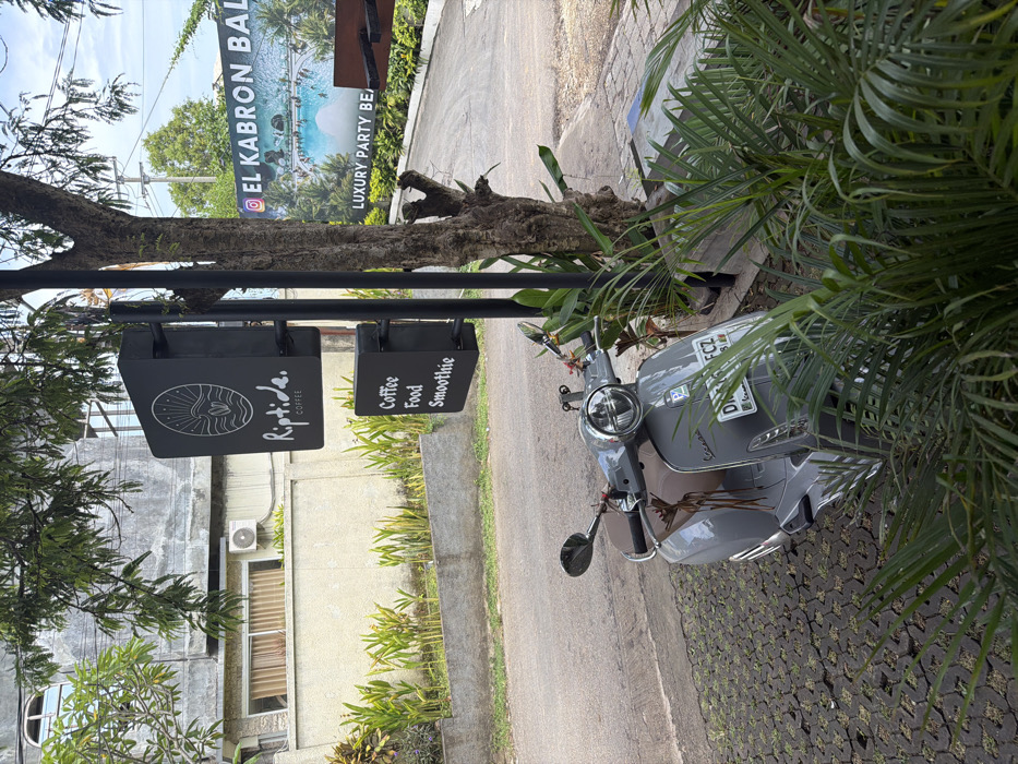A Vespa scooter parked on a paved area, next to lush green foliage, is featured in a slightly tilted, medium shot. Behind the scooter is a signpost displaying "Riptide Coffee" and "Coffee Food Smoothie" signs. Further in the background, a building facade and a sign for "El Kabron Bali Luxury Party Beach" are visible. The scene appears to be outdoors on a bright day, with a focus on the scooter and the coffee shop sign.