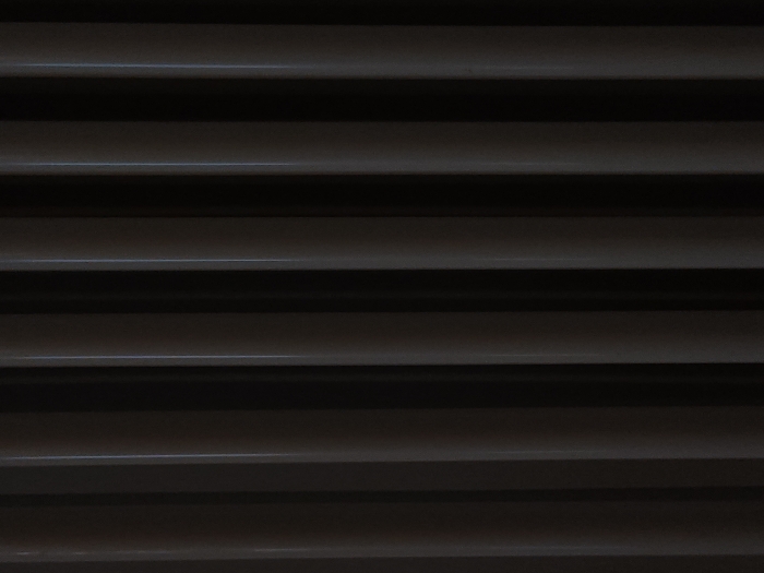 The image displays a close-up, abstract view of a series of dark, vertically fluted architectural elements