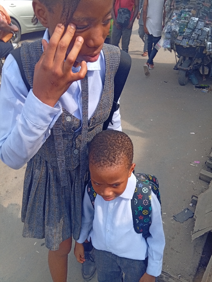 Two children wearing school uniforms stand on a street. The older child, wearing a dress and vest, touches their forehead. The younger child, wearing pants and carrying a backpack, looks down. Both are wearing light blue shirts and backpacks. Other people and a cart loaded with objects are in the background. The setting appears to be a bustling street or market area.