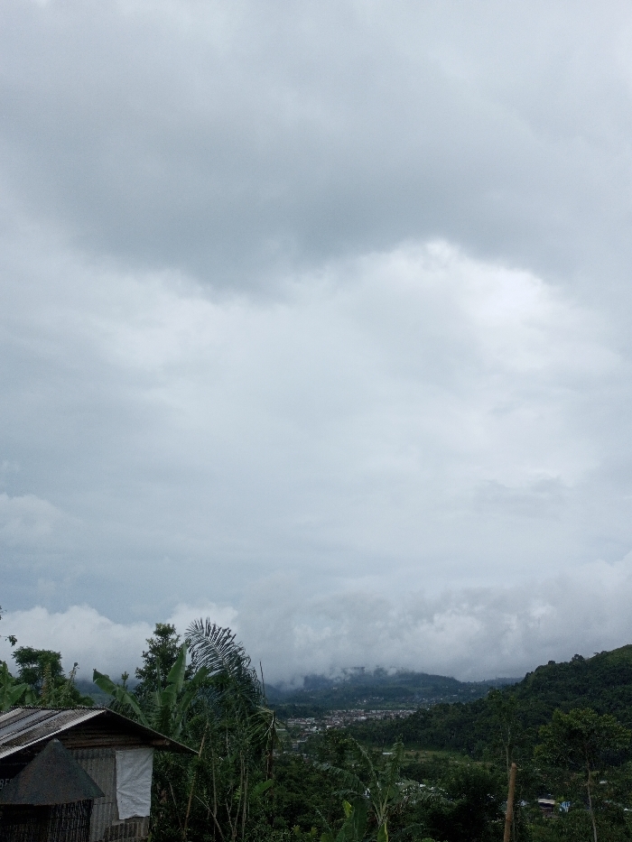 This image presents an elevated panoramic view of Ciloto, Indonesia, under a predominantly overcast sky. The upper two-thirds of the frame are filled with dense, grey cloud cover. In the midground, a band of low-lying mist partially obscures distant hills, below which a compact settlement or town with numerous buildings and light-colored roofs is visible within a valley. The foreground and surrounding terrain are characterized by dense, verdant vegetation, including various trees, broad-leafed plants, and palm fronds. In the lower left foreground, a portion of a rustic structure is visible, featuring a corrugated metal roof, a wall section covered by white fabric, and a dark, conical element positioned below its roofline. No individuals, specific actions, or interactions are observable within the scene.