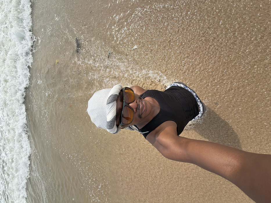 - "A single adult male is depicted in a selfie, standing in shallow ocean water at a beach in Alaguntan, Nigeria" by FM-rkm0j2, licensed under CC BY 4.0