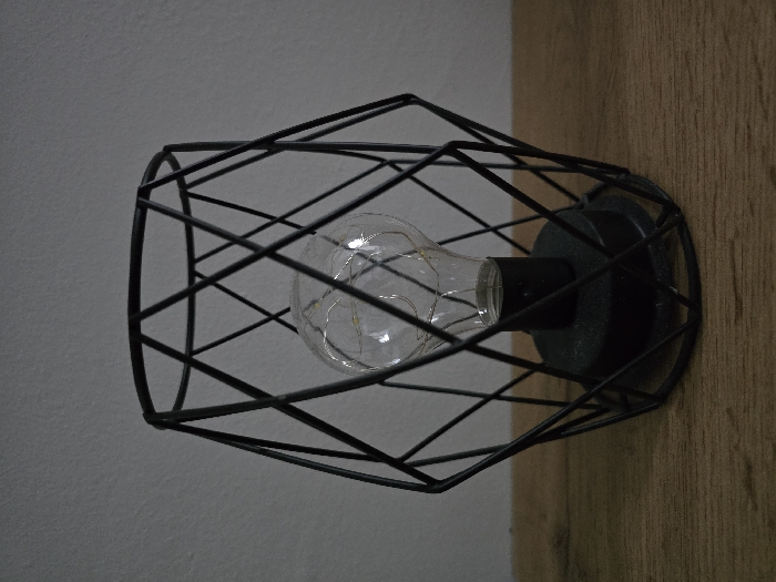 An unlit decorative table lamp rests on a light brown wooden surface. The lamp consists of a black, open-cage metal frame, geometrically formed by thin metal rods. Inside the frame, a clear glass bulb encloses an unlit string of small, warm white LED lights. The bulb is secured to a black, circular base, which rests on the wooden surface within the lamp's frame. A plain, light gray textured wall serves as the background. No human subjects are depicted. This interior scene is located in Kumanovo, North Macedonia.