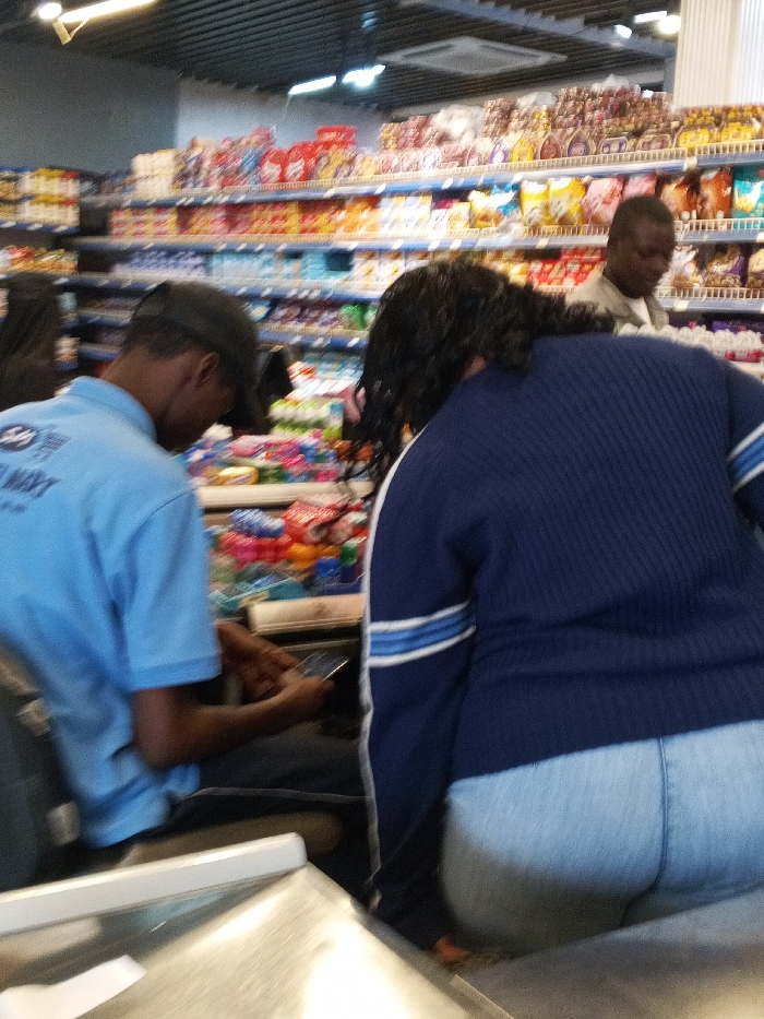 The image displays an interior view of a retail establishment, likely a supermarket or convenience store, located in Tarauni, Nigeria. In the foreground, a dark-skinned male, wearing a light blue polo shirt with visible "SMART" lettering and a dark baseball cap, is seated or leaning forward, looking down at a smartphone held in his hands. To his right, a person is seen from the back, wearing a dark blue ribbed long-sleeved sweater with two light blue and white horizontal stripes on the upper arm, and light blue jeans. A metallic-surfaced counter is partially visible in the immediate foreground. In the mid-ground, a dark-skinned male in a light-colored shirt stands facing rows of shelves stocked with various packaged food items and snacks. The background features extensive shelving filled with numerous consumer products, brightly lit by overhead fixtures. The ceiling is dark and textured, possibly corrugated.