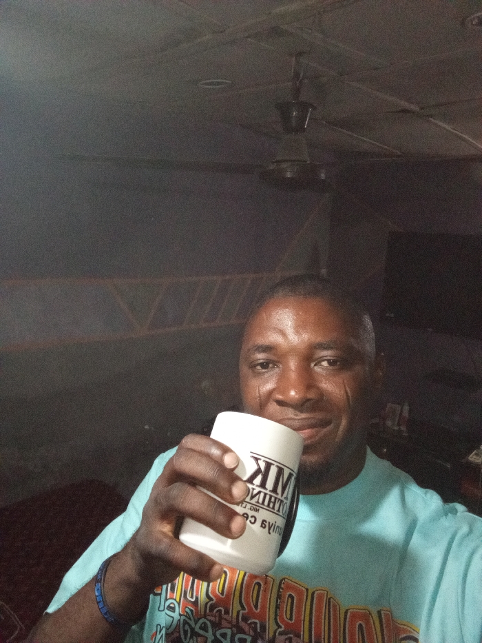 A man holds a white mug with "MK Clothing Co." printed on it. He's wearing a light blue t-shirt with a graphic design. The background is dimly lit, with a ceiling fan and what appears to be a ladder visible. The man is looking at the camera, with a slight smile. The photo has low lighting, possibly taken indoors. The overall impression is casual and informal.