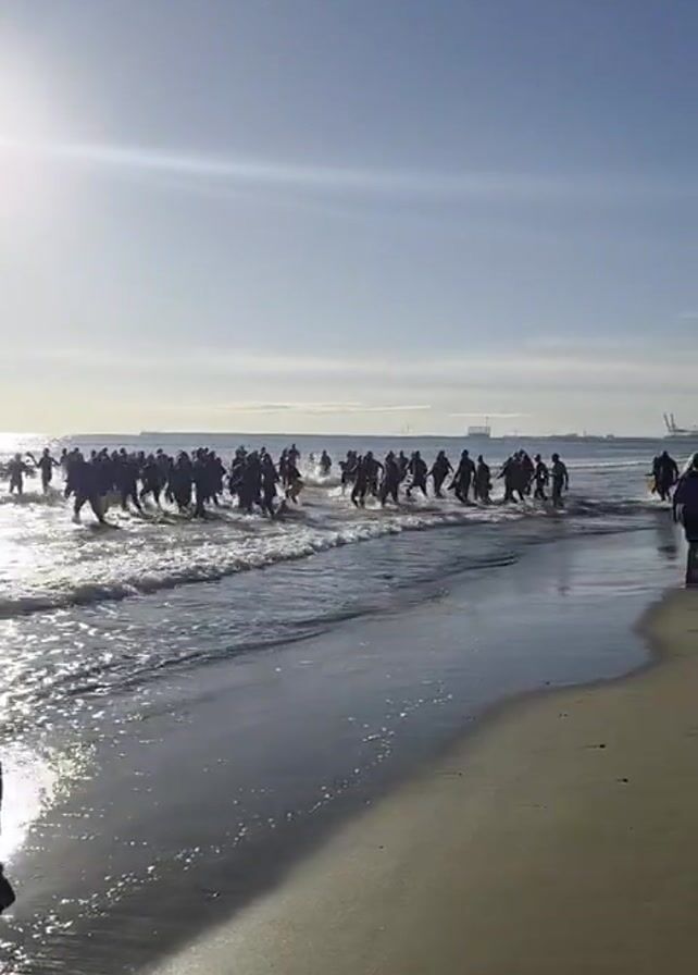 On a sunny day at the beach, a crowd of people is wading into the ocean. Many other people are standing on the sandy shore watching and taking photos. The ocean is a light blue, and the sky is clear with some light clouds. A cityscape is visible in the far distance.