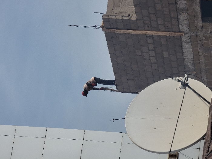 The image depicts an outdoor urban scene in Maiburiji, Nigeria, under a clear blue sky. An adult male is positioned on the top of an unrendered grey concrete block wall, bending forward at the waist while holding a long, slender tool. He wears a light-colored long-sleeved shirt, dark trousers, and a red baseball cap. Exposed vertical rebar sections protrude from the top of the concrete wall, indicating ongoing construction. A vertical wooden plank is secured to the wall's right side. In the lower-left foreground, a large, white, circular satellite dish with a central feed arm and visible cabling partially obstructs the view of the wall. To the far left, a section of a multi-story building with a light-colored, panelled facade featuring dark grid lines is visible against the sky.