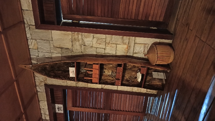 A canoe-like wooden display, mounted on a light stone wall, is adorned with small wooden shelves and two informational plaques. A woven basket rests near the canoe’s stern. The surrounding architecture features dark wood paneling, creating a rustic, interior setting. The photo's orientation gives a unique perspective, as if viewing the scene from below, enhancing the unusual placement of the canoe.