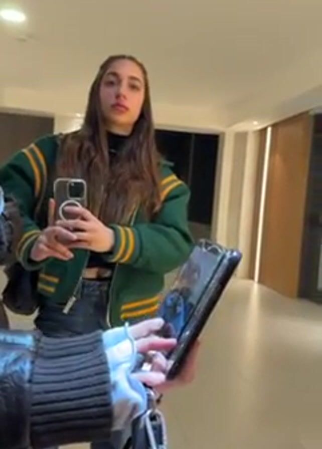 A young woman with long brown hair, wearing a green and yellow jacket and jeans, is taking a mirror selfie in a hallway. Another person, wearing a grey sweater, is holding up two smartphones, each with a cracked screen, displaying a video call featuring the same young woman. The video calls appear to be live recordings of the selfie being taken in the mirror. The hallway has light-colored walls and a polished floor. There is an exit sign visible in the background.