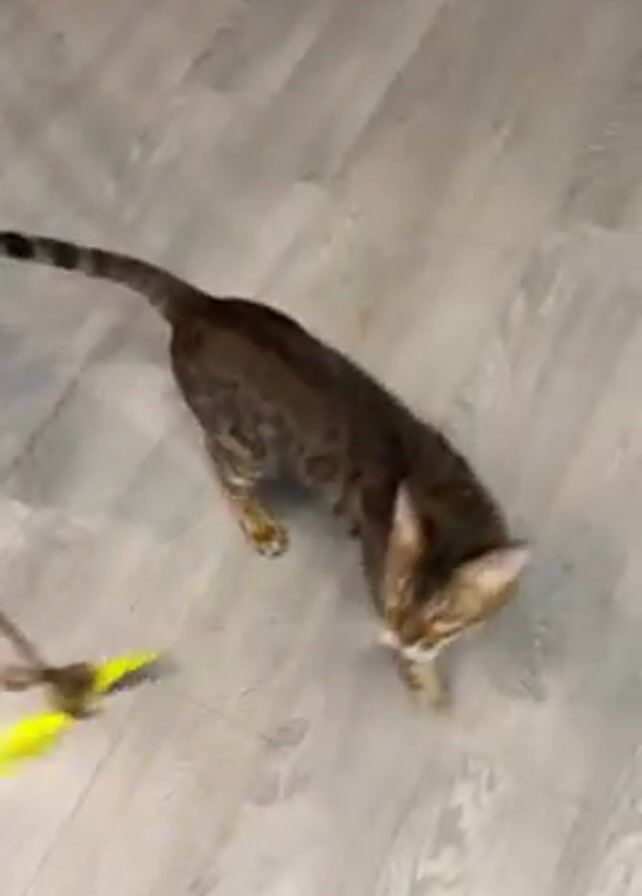 A Bengal cat is shown playing with a toy. The cat has a brown and black spotted coat and is standing on its hind legs, trying to catch a yellow toy attached to a string. The floor is light gray wood-grain. The camera is slightly elevated and oriented downwards toward the cat.