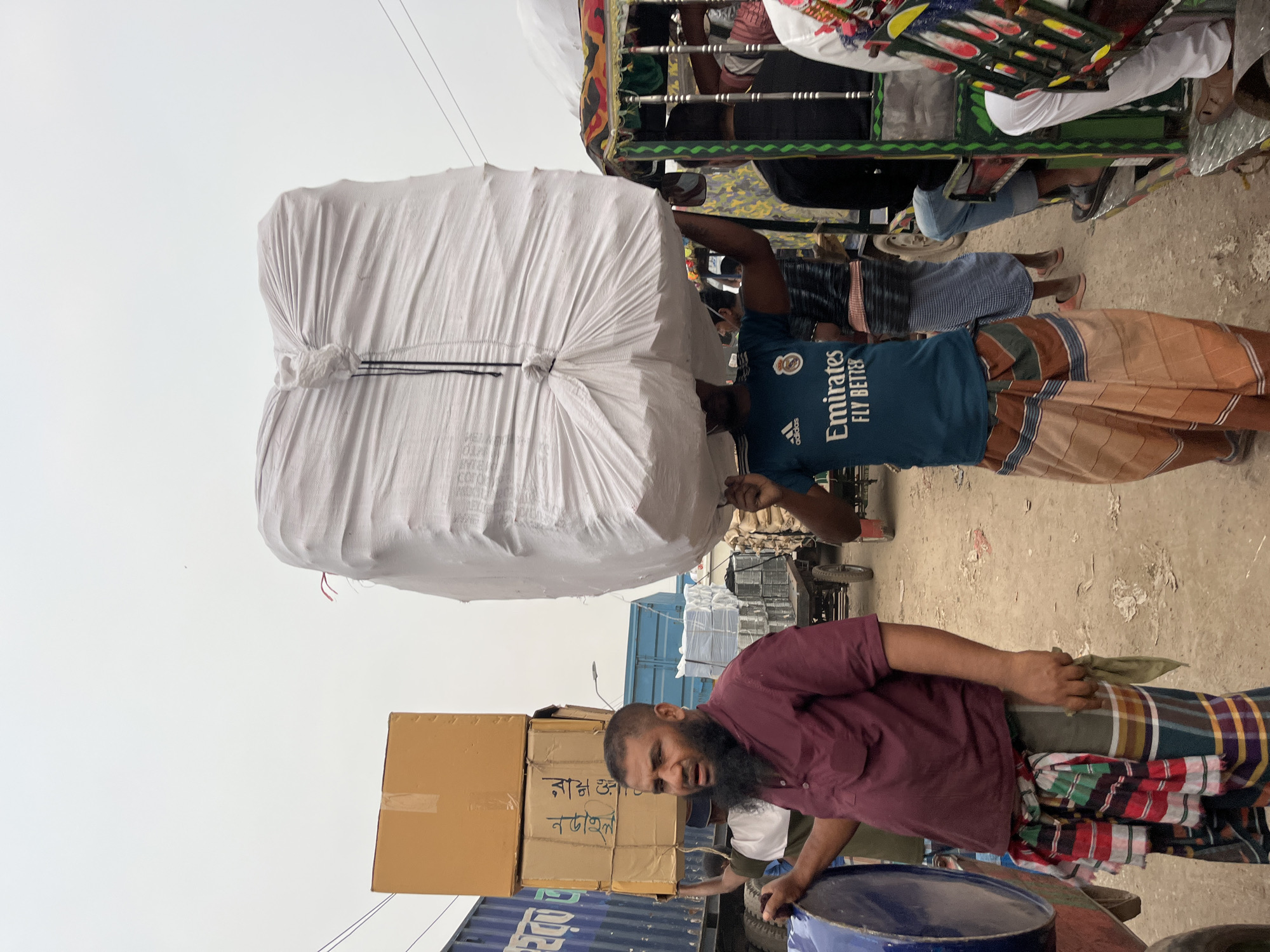 In Dhaka, Bangladesh, the image captures a street scene with people and goods. A man with a beard, wearing a maroon shirt and patterned lungi, stands in the foreground near a blue metal drum. Adjacent to him are stacks of cardboard boxes marked with writing in Bengali. Behind him is a partially visible container truck. A second man, seen above, carries a large white sack on his head. He wears a blue football jersey and a brown striped lungi. A crowded rickshaw with multiple passengers and green metal bars is visible in the background. The ground appears to be a mix of pavement and dirt. Overhead electrical wires are visible.