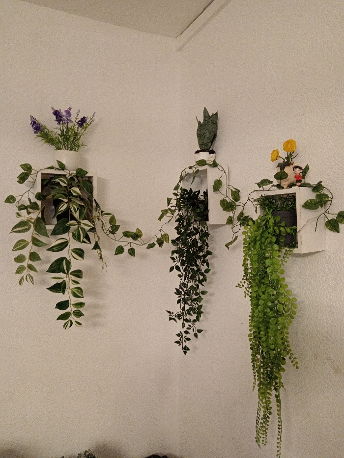 Three white square shelves are mounted on a white wall. Each shelf contains greenery, with trailing plants cascading down. The leftmost shelf holds a plant with green and white striped leaves and purple flowers. The center shelf displays a plant with narrow, dark green leaves and a green faux succulent on top. The rightmost shelf features a lush, bright green, cascading plant, topped with yellow flowers and a small figurine. Thin vines connect the plants on the shelves.