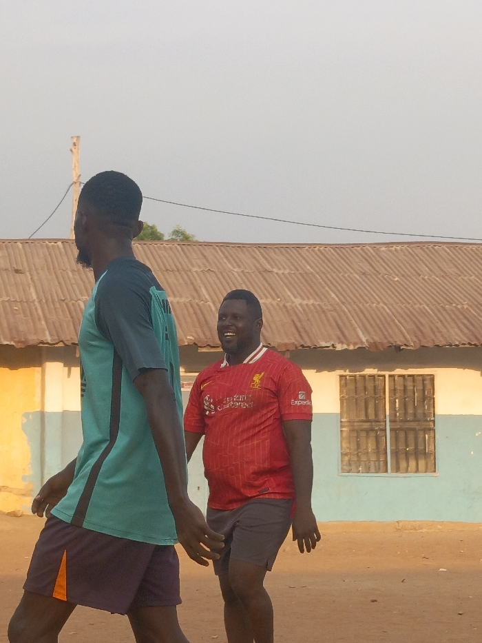 The scene depicts two adult males outdoors on an unpaved dirt ground in Akwanga, Nigeria. In the left foreground, a dark-skinned male with short dark hair and a beard is partially turned away from the camera, facing right. He wears a teal and dark grey short-sleeved sports shirt and dark shorts with an orange side accent, appearing to be in mid-stride. To his right, a second dark-skinned male with a heavier build and short dark hair faces slightly left, smiling broadly with visible teeth. He wears a red Liverpool FC soccer jersey and dark grey shorts, with his hands at his sides. In the background, a single-story building features a weathered corrugated metal roof. Its walls are painted in horizontal sections of light yellow, white, and light blue. Two windows with horizontal and vertical security bars are visible on the building's facade. A wooden utility pole stands behind the first male, extending into a hazy, light grey sky. A thin black utility wire traverses horizontally across the upper midground. Minimal green foliage is visible behind the pole, above the building.