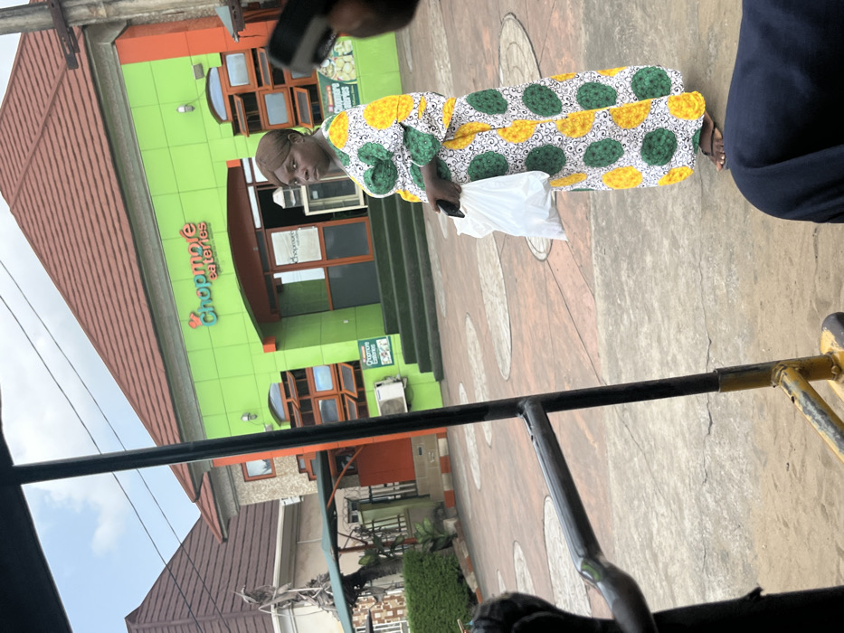 The image depicts the exterior of "Chopmore Eateries" in Adankolo, Nigeria, viewed from within a vehicle. The eatery building is prominently featured with a lime-green facade, orange accent trim, and a red-tiled roof. Its entrance consists of glass doors accessible via green steps. Several louvered windows with orange frames are visible, along with an external air conditioning unit. A woman of apparent African descent stands in the mid-ground, facing the camera. She wears a long, patterned dress with large green and yellow circles on a white background. She holds a white plastic shopping bag in her left hand and a dark-colored smartphone in her right. Her feet are bare, wearing dark flip-flops. The ground in front of the eatery is paved with light brown concrete featuring subtle circular patterns. In the foreground, a black and yellow metal frame, consistent with the interior structure of a tricycle (Keke Napep), partially obstructs the view. Parts of a person's arm and leg in dark clothing are visible in the extreme foreground, indicating the photographer's position. Behind the eatery, another building with a brown-tiled roof and some foliage is visible. The sky is overcast, and overhead utility wires cross the upper portion of the frame.