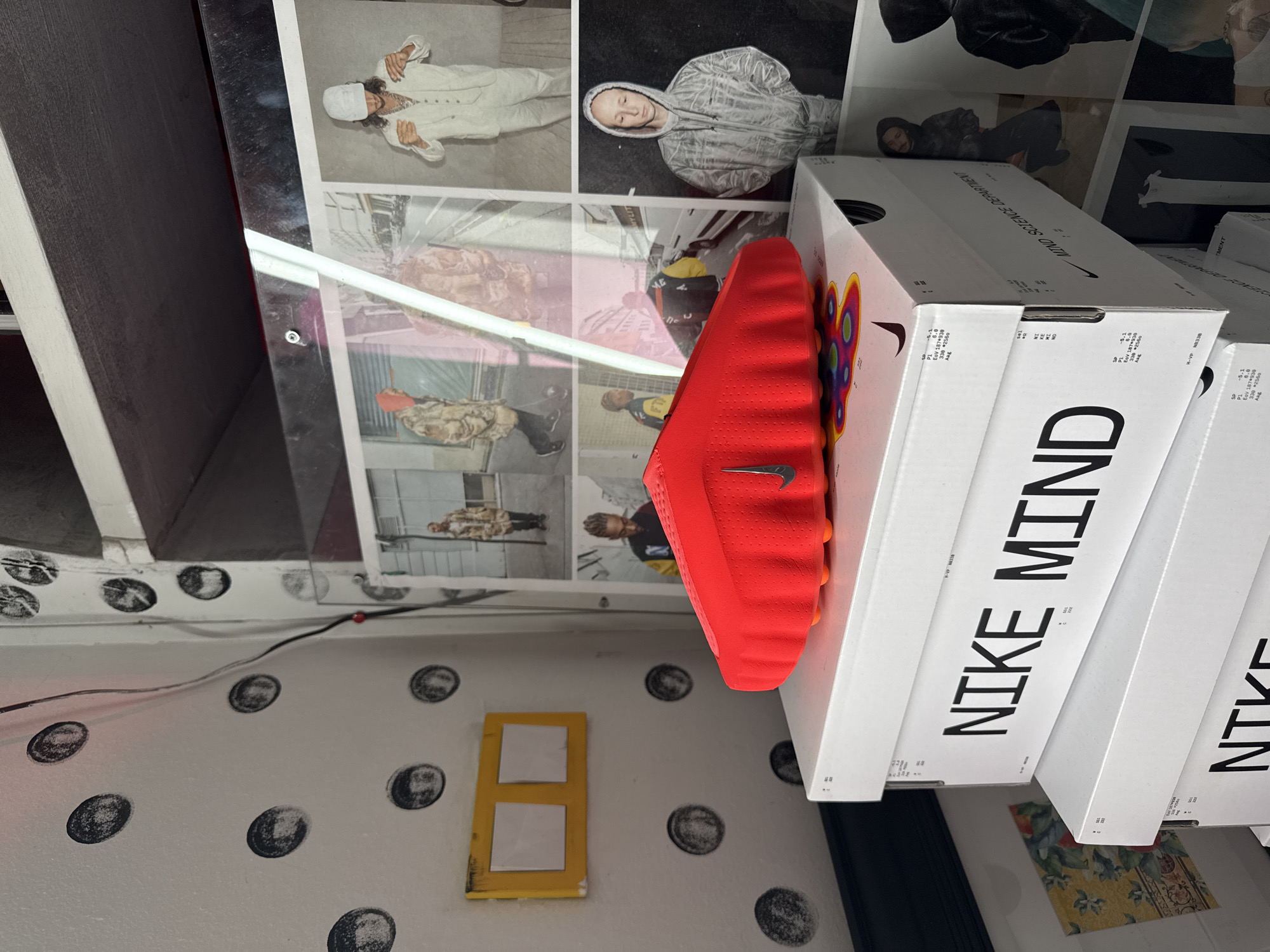 white wall with black circles painted on it, along with a yellow object with two white squares. A red shoe sits on top of several white Nike MIND boxes, which are stacked next to each other. Above the shoe and boxes, a framed collage of photos can be seen. The photos feature people in various poses and outfits. The image does not contain any information that reveals its location in the city of Sofia, Bulgaria.