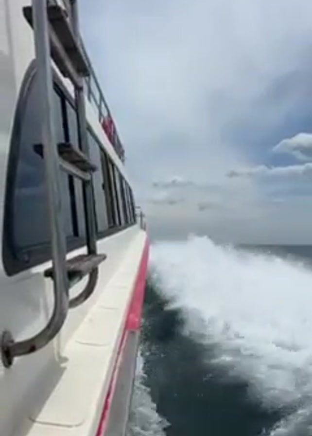 view from the side of a moving boat. The boat is white with a red stripe along the edge. There are windows and a ladder visible on the side of the boat. The water is choppy and white from the boat's movement, contrasting against the deeper blue of the open sea. The sky is partly cloudy with a mix of blue and white. The perspective is looking forward along the boat.