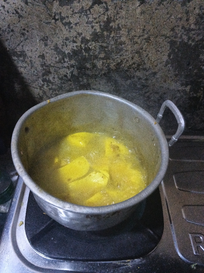 An overhead, slightly angled view captures a metal pot containing yellow food items boiling in a liquid, positioned on a gas stove burner